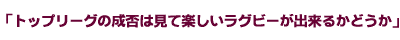 土 田 大事なことは、トップリーグはテストマッチではないということです。国と国の代表が戦う場合は、お互いにどうしても勝たなければいけない、1点差でも何点差でも、とにかく勝利が優先される。そのラグビーとは質が違うようにならないといけないということです。例えばサントリーが神戸と2試合やって、勝ったとする。勝敗ということからすれば、いいラグビーをしたと。でも、実際やっているラグビーは、質が悪いということもある。「サントリーは神戸から70点取ったけれど、やってるラグビーは全然面白くない」「神戸の方がはるかにボールを回しているじゃないか」ということもあるわけです。そういう時には、見に来てくれたファンの人は「何だそのラグビーは。全然、面白くないじゃないか」ということをはっきり言う。ゲームを中継しているテレビ局も「あのラグビーは面白くない。質が違う」という点をはっきり指摘する。そういう環境を含めて「ラグビーの質」が変わっていかないといけない。ただ、勝った負けただけでは、う〜ん…、たぶん上手くいかないのではないかという気がするんです。